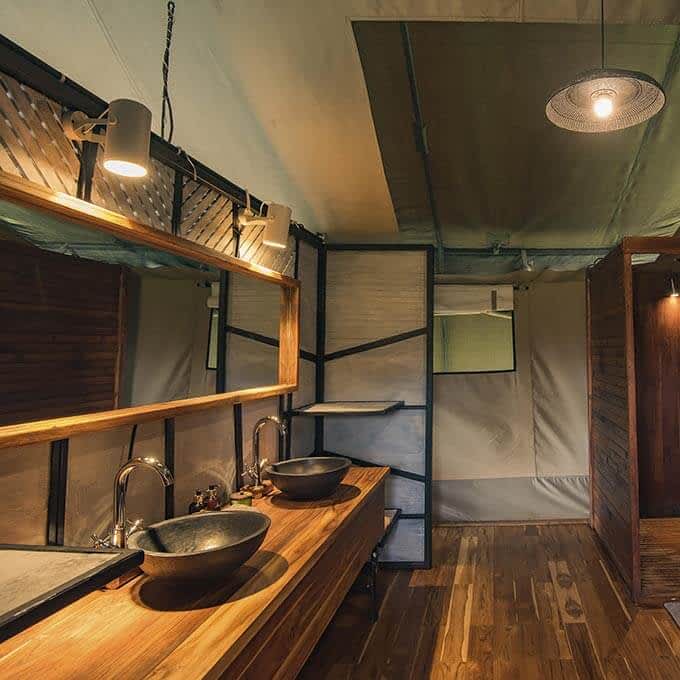 Each of the eight glorious canvas tents has a private deck with a built-in sofa so you can either wake up and enjoy your morning coffee or settle down in the evening with a glass of wine and look out over the golden plains. The spacious bedroom is designed for practicality and luxury, with a four-poster double bed for you to rest your head, readying you for the next day's adventure. The simplistic design was created so as not to pull away from the beauty of the landscape. Every tent has its private bathroom with double sinks and a hot shower, designed with natural wood fixtures for optimal luxury.